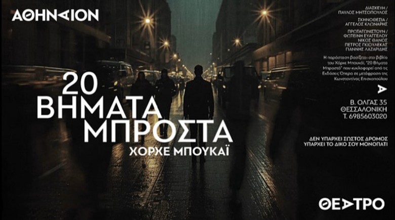 Το παγκόσμιο best seller «20 Βήματα Μπροστά» του Χόρχε Μπουκάι παρουσιάζεται δραματοποιημένο, για πρώτη φορά στην Ελλάδα, σε σκηνοθεσία Άγγελου Κλωνάρη στη σκηνή του ανανεωμένου θεάτρου Αθήναιον.