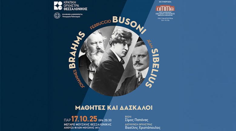 Η Κρατική Ορχήστρα Θεσσαλονίκης συνεχίζει τον επιτυχημένο κύκλο συναυλιών της ‘Μαθητές και δάσκαλοι’ με έργα των Μπραμς, Μπουζόνι και Σιμπέλιους, με σολίστ τον Διευθυντή της και διεθνώς αναγνωρισμένο βιολιστή Σίμο Παπάνα και μαέστρο τον σπουδαίο Έλληνα αρχιμουσικό Βασίλη Χριστόπουλο.