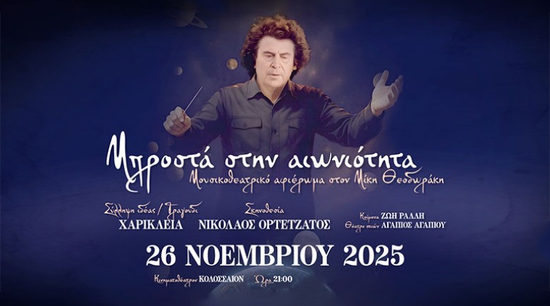 - 9€ από 13€ για Είσοδο 1 Ατόμου στη Μουσικοθεατρική Παράσταση «Μπροστά στην Αιωνιότητα», ένα Μουσικοθεατρικό Αφιέρωμα στον Μίκη Θεοδωράκη, στο Κινηματοθέατρο Κολοσσαίον