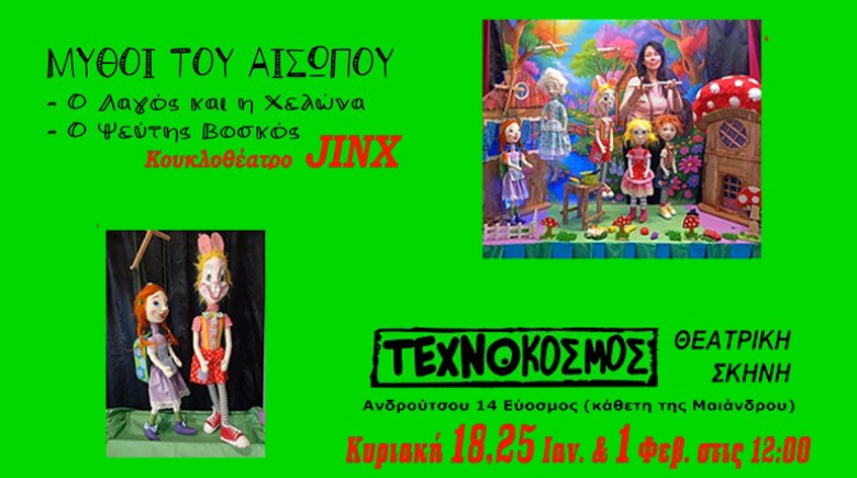 Η νέα παράσταση της ομάδας @Κουκλοθέατρο JINX έρχεται στον Τεχνόκοσμο Θεατρική σκηνή για 3 παραστάσεις, Κυριακή 18/1, 25/1 και 1/2. στις 12:00. Διαδραστικό κουκλοθέατρο βασισμένο σε 2 από τους πιο αγαπημένους, διαχρονικούς μύθους του Αισώπου σε μία ενιαία, ζωντανή και κουκλοθεατρική παράσταση. Μια μαγική ώρα γεμάτη γέλιο, παιχνίδι και σημαντικές αξίες ζωής για όλη την οικογένεια.
